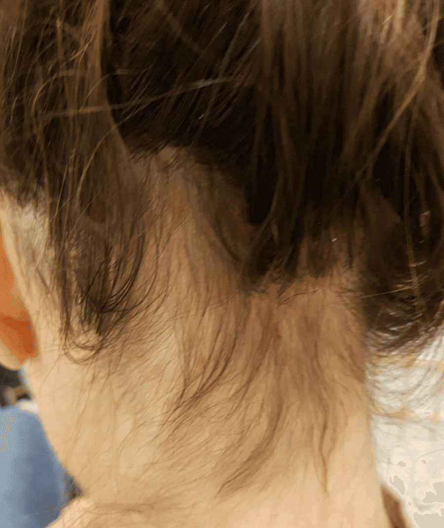 Frontale fibroserende alopecia (FFA) is wordt gekenmerkt door geleidelijk haarverlies langs de haargrens aan de voorkant van het hoofd en soms breidt het uit naar de slapen en wenkbrauwen. Bij deze klant is goed te zien hoe de haargroei in dit gebied weer is toegenomen en de huid er rustiger uitziet.